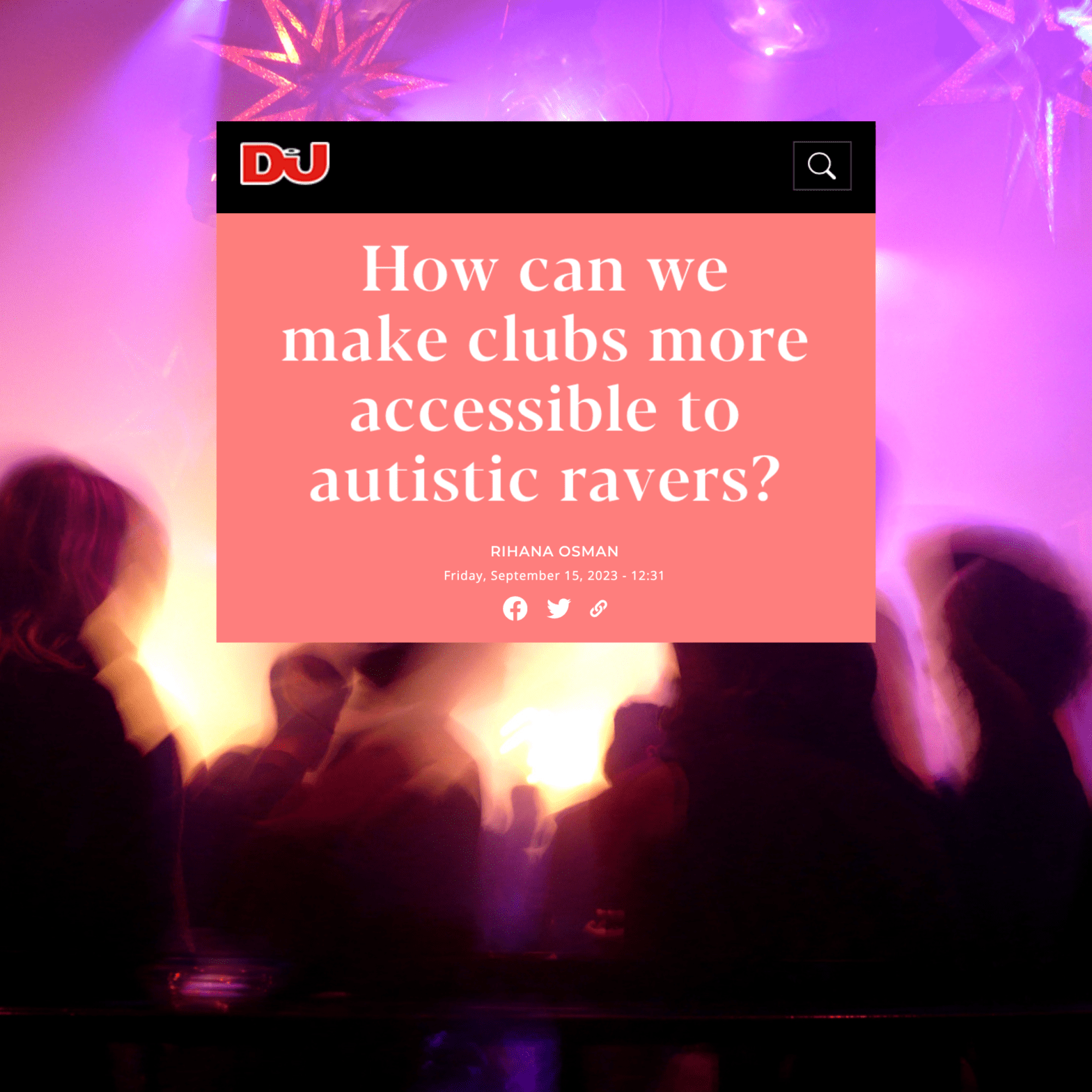 Cathy and Keren recently contributed to an article written by Rihana Osman for DJ mag entitled ‘How can we make clubs more accessible to autistic ravers?‘ In this article, many autistic people give their views on what the challenges are and what can be done to make nightclubs more accessible, and Cathy and Keren shared some of the findings from the Sensory Street research.